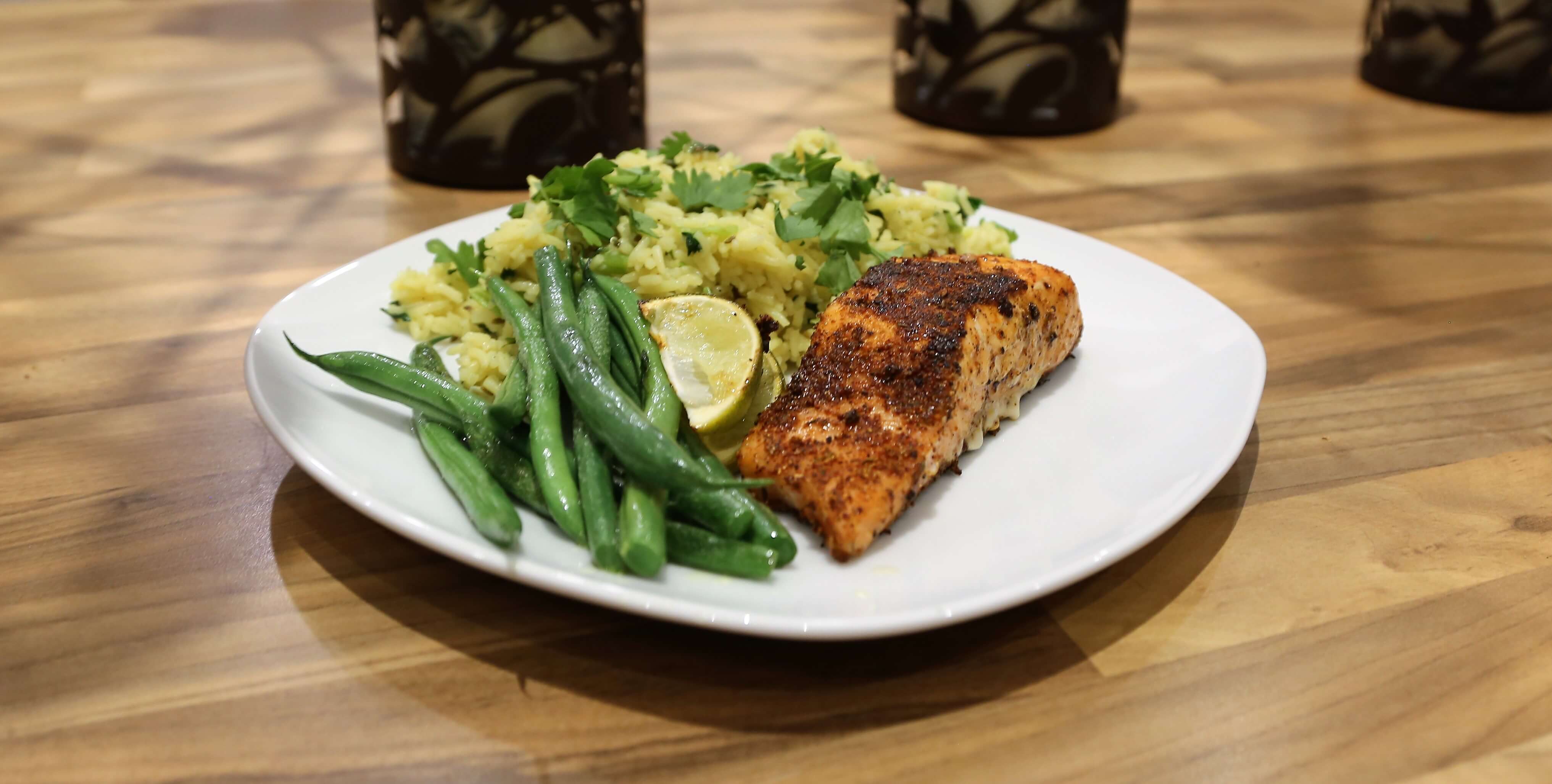 - Divide the rice between four serving plates and garnish with remaining coriander. Top with the salmon fillets and serve with green beans and the seared lime wedges on the side.